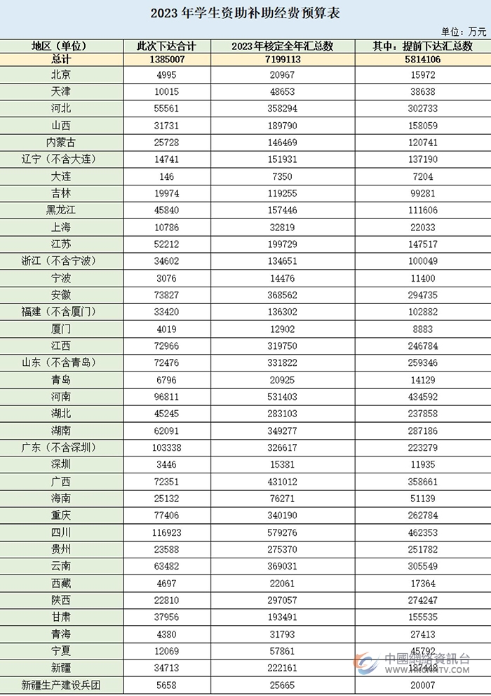 人民网北京5月16日电 (记者任妍)记者从财政部获悉,财政部、教育部、人力资源社会保障部日前发布《关于下达2023年学生资助补助经费预算的通知》(以下简称《通知》),核定下达各省(自治区、直辖市、计划单列市、新疆生产建设兵团,以下统称省)2023年学生资助补助经费预算,用于落实普通高中、中等职业教育、高等教育国家学生资助政策。数据显示,2023年学生资助补助经费核定全年汇总数7199113万元,其中提前下达汇总数5814106万元,此次下达合计1385007万元;2023年地方高校国家资助经费核定全年汇总数4172728万元,提前下达3111902万元,此次下达总额1060826万元。