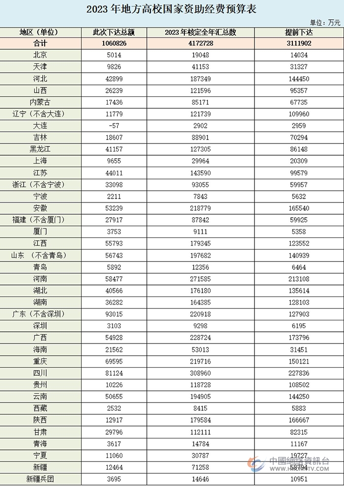 2023年地方高校国家资助经费预算表。图片来源:财政部官网