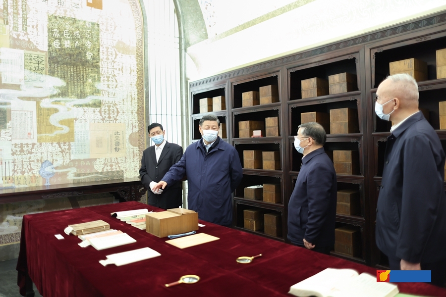 6月2日,中共中央总书记、国家主席、中央军委主席习近平在北京出席文化传承发展座谈会并发表重要讲话。这是座谈会前,习近平1日下午在中国国家版本馆考察时,在兰台洞库了解馆藏精品版本保存情况。