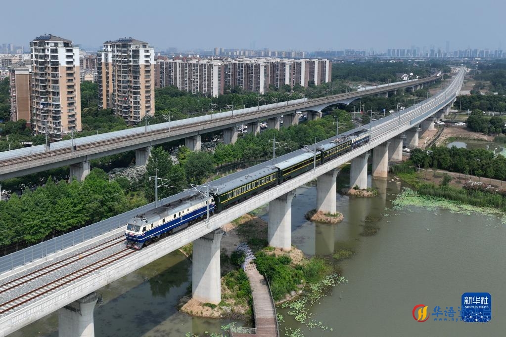 6月15日,检测列车行驶在沪宁沿江高铁南京市境内的线路上(无人机照片)。