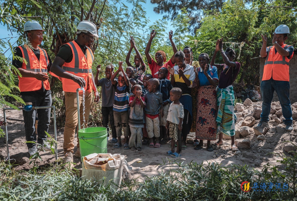 6月13日,在坦桑尼亚姆万扎省米松圭,中土东非有限公司员工接通水管后赢得当地居民鼓掌欢呼。新华社记者 王冠森 摄