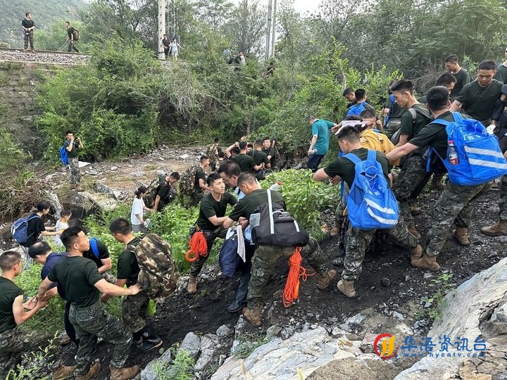7月31日傍晚,门头沟区雨势仍然很大,武警战士们肩扛、手提、背背,携带面包、方便面、矿泉水和火腿肠,奔赴落坡岭、安家庄火车站,将物资送给因火车停运而受困的旅客。