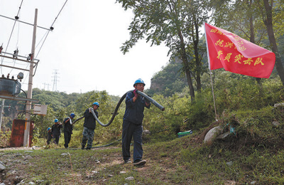 8月8日,国网河北涞水县供电公司党员突击队队员在三坡镇下庄村拒马河畔搬运电缆。 |