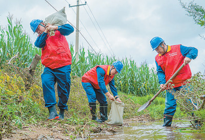 8月8日,国网吉林四平供电公司共产党员服务队队员在修复电力线路沿线护坡。 |