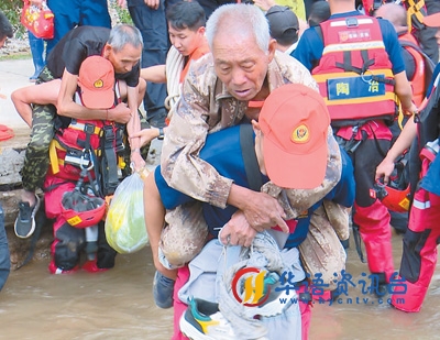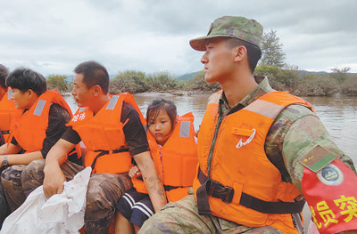 8月7日,黑龙江省哈尔滨市五常市沙河子镇大贵村,陆军第78集团军某旅党员突击队队员在转移受困群众。 |