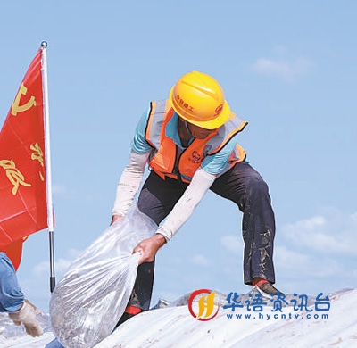 日前,中铁建工集团工人抗洪抢险党员先锋队队员在天津滨海新区太平镇子牙新河沿线加固堤坝。 |