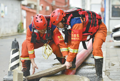 日前,河北省邯郸市消防救援支队党员突击队队员在涿州市双塔区进行排涝作业。 |