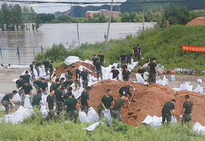 8月6日,武警黑龙江总队牡丹江支队官兵在牡丹江畔装沙袋、垒堤坝。 |