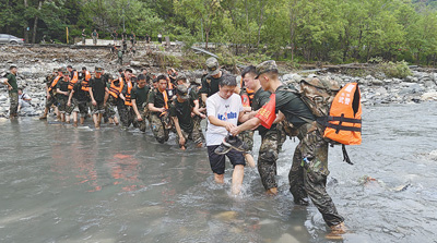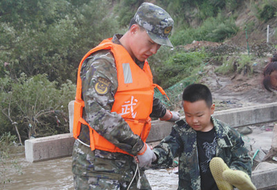 8月8日,武警吉林总队党员先锋队在舒兰市开原镇开展抢险救援。图为武警战士在帮助小朋友渡河。 |