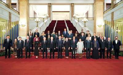10月17日晚,国家主席习近平和夫人彭丽媛在北京人民大会堂举行宴会,欢迎来华出席第三届“一带一路”国际合作高峰论坛的国际贵宾。这是习近平和彭丽媛同国际贵宾合影留念。 |