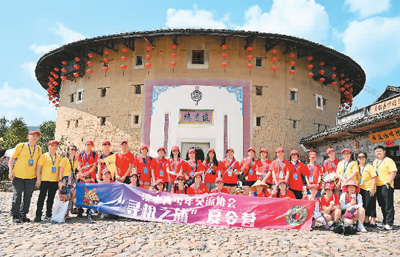在福建省漳州市,参加“世遗泉州 悦见丰泽”2023年“中国寻根之旅”夏令营的营员在南靖土楼前合影。 |