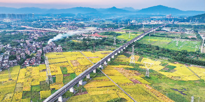 在广东清远,列车从金黄的稻田穿行而过。 |