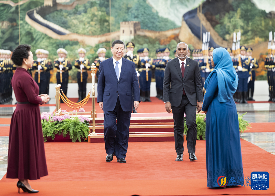 1月10日下午,国家主席习近平在北京人民大会堂同来华进行国事访问的马尔代夫总统穆伊兹举行会谈。这是会谈前,习近平和夫人彭丽媛在人民大会堂北大厅为穆伊兹和夫人萨吉达举行欢迎仪式。新华社记者 黄敬文 摄