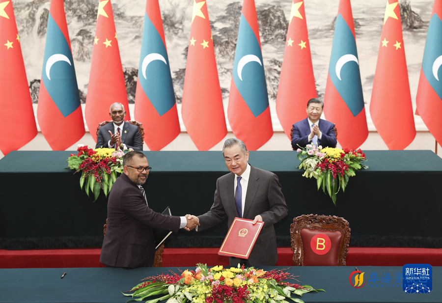 1月10日下午,国家主席习近平在北京人民大会堂同来华进行国事访问的马尔代夫总统穆伊兹举行会谈。这是会谈后,两国元首共同见证签署双边合作文件。新华社记者 丁海涛 摄