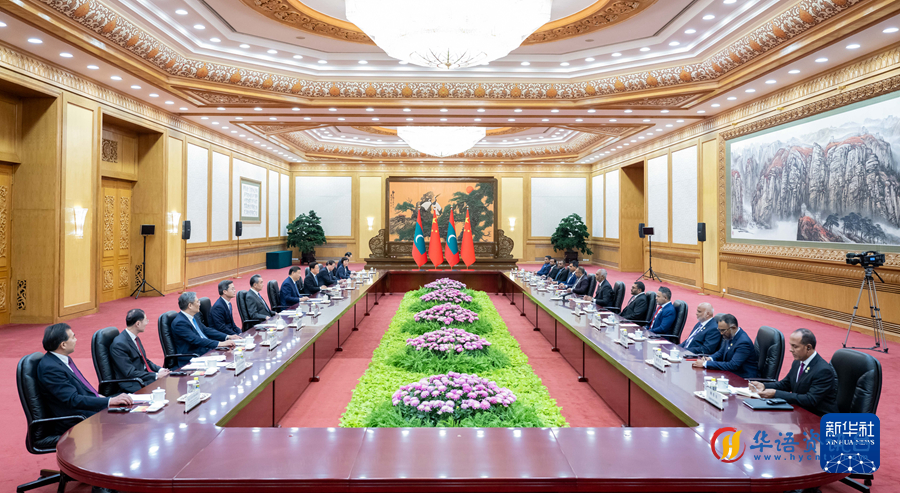 1月10日下午,国家主席习近平在北京人民大会堂同来华进行国事访问的马尔代夫总统穆伊兹举行会谈。新华社记者 翟健岚 摄