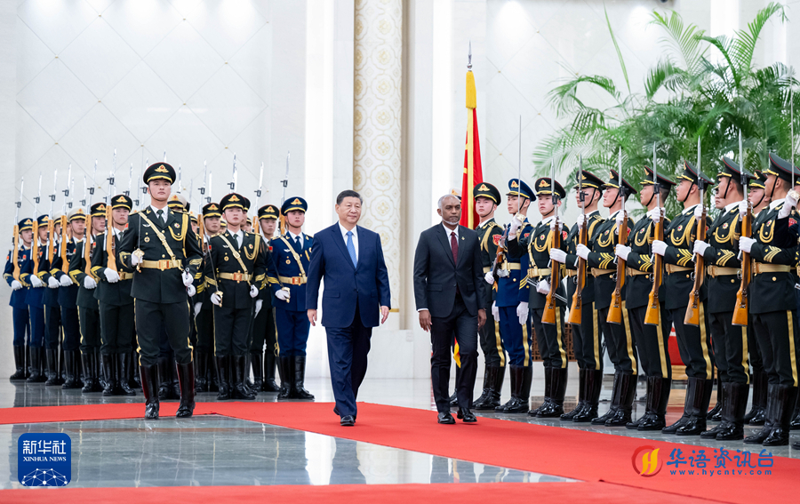 1月10日下午,国家主席习近平在北京人民大会堂同来华进行国事访问的马尔代夫总统穆伊兹举行会谈。这是会谈前,习近平在人民大会堂北大厅为穆伊兹举行欢迎仪式。新华社记者 翟健岚 摄