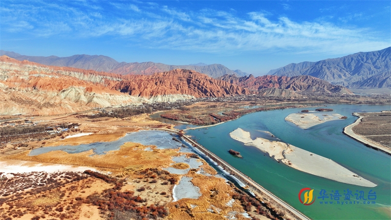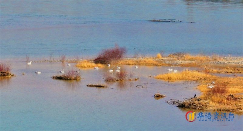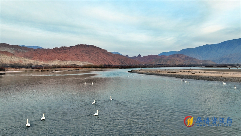 寒冬时节,位于青海省海南藏族自治州贵德县境内的千姿湖景色迤逦,大天鹅在湖水中或起舞或休憩,丹霞山在岸畔巍峨连绵。
