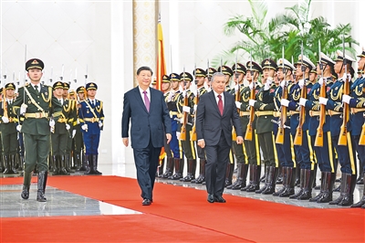 天安门广场鸣放21响礼炮,礼兵列队致敬。两国元首登上检阅台,军乐团奏中乌两国国歌。米尔济约耶夫在习近平陪同下检阅中国人民解放军仪仗队,并观看分列式。