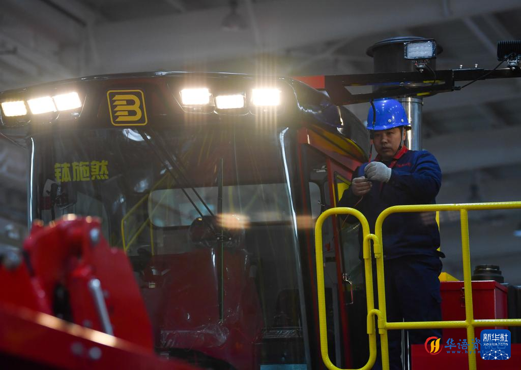 在新疆钵施然智能农机股份有限公司采棉机生产车间,工人在检测采棉机(2月28日摄)。