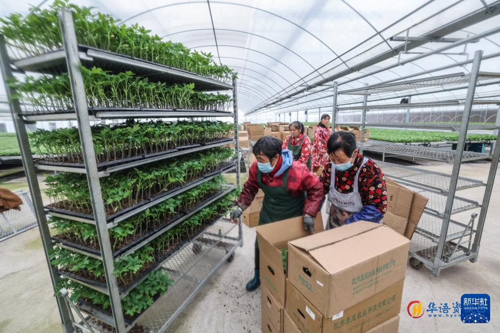 3月6日,在位于桐乡市高桥农业科技产业园的中科康成数字化育苗车间内,工作人员把培育好的种苗装箱。目前,该育苗基地年产2亿株蔬菜、瓜果种苗,主要供应长三角地区。