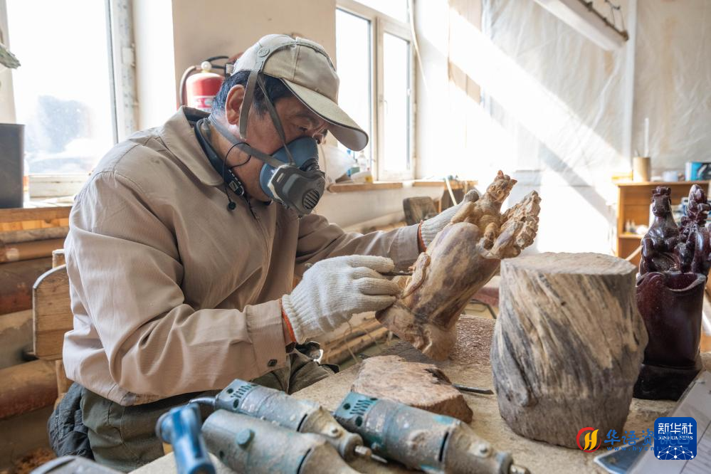 3月14日,在伊春市一家木艺公司的生产车间,工作人员在雕刻木雕摆件。