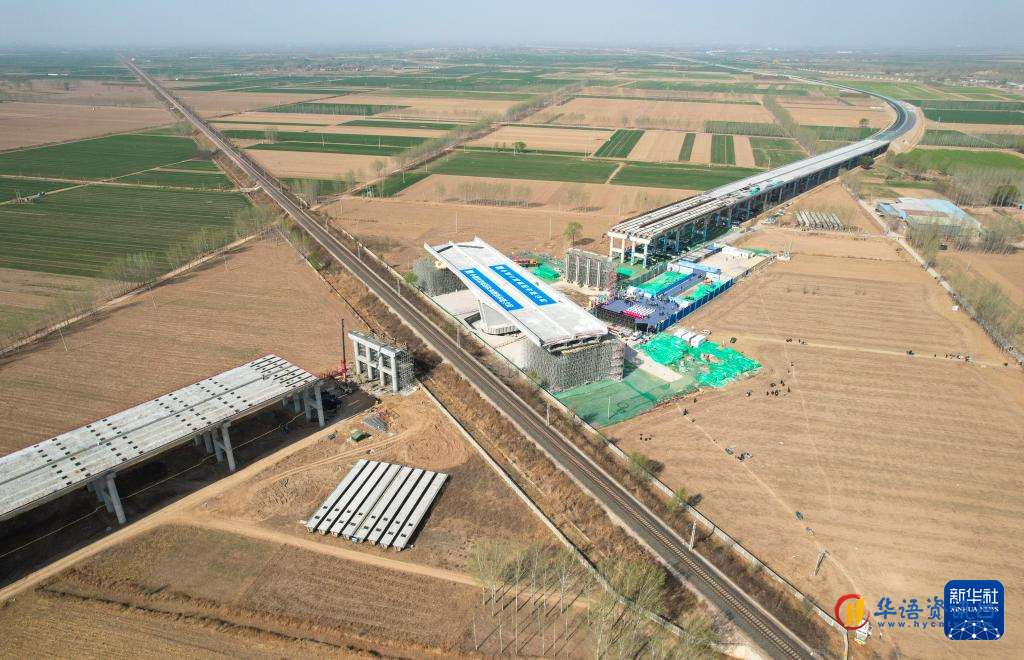 上跨邯黄铁路分离式立交桥等待转体(3月31日摄,无人机照片)。