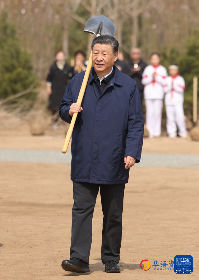 4月3日,党和国家领导人习近平、李强、赵乐际、王沪宁、蔡奇、丁薛祥、李希、韩正等来到北京市通州区潞城镇参加首都义务植树活动。这是习近平扛起铁锹走向植树地点。新华社记者 庞兴雷 摄