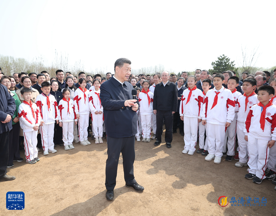 挥锹铲土、培土围堰、提水浇灌……习近平接连种下油松、黄栌、元宝枫、樱桃、红叶碧桃、侧柏等多棵树苗。习近平一边植树,一边询问孩子们的学习生活、劳动锻炼情况。他强调,广大青少年是祖国的未来,从小要积极参加劳动、植树造林,把绿色的种子种进心里,养成尊重自然、热爱自然的意识,勤奋学习、锻炼身体、茁壮成长,德智体美劳全面发展,努力成为国家栋梁。植树现场一派热火朝天的劳动景象,领导同志们同大家一起培土浇水,气氛热烈。