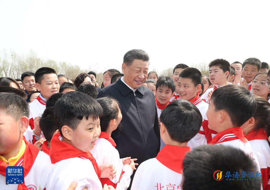 4月3日,党和国家领导人习近平、李强、赵乐际、王沪宁、蔡奇、丁薛祥、李希、韩正等来到北京市通州区潞城镇参加首都义务植树活动。这是习近平同少先队员在一起。新华社记者 鞠鹏 摄