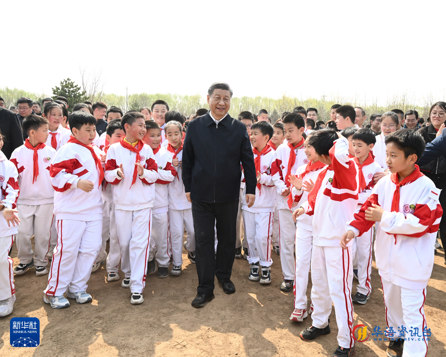 4月3日,党和国家领导人习近平、李强、赵乐际、王沪宁、蔡奇、丁薛祥、李希、韩正等来到北京市通州区潞城镇参加首都义务植树活动。这是习近平同少先队员在一起。新华社记者 李学仁 摄