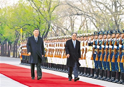 四月九日下午,国家主席习近平在北京人民大会堂同来华进行国事访问的密克罗尼西亚联邦总统西米纳举行会谈。这是会谈前,习近平在人民大会堂东门外广场为西米纳举行欢迎仪式。 |