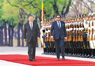 四月十二日下午,国家主席习近平在北京人民大会堂同来华进行国事访问的苏里南总统单多吉举行会谈。这是会谈前,习近平在人民大会堂东门外广场为单多吉举行欢迎仪式。 |