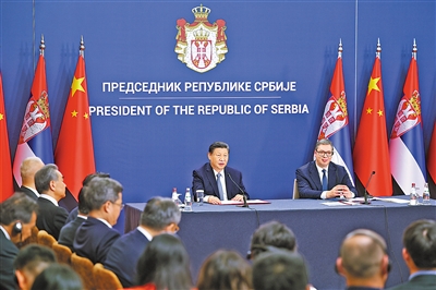 本报贝尔格莱德5月8日电 (记者王海林、谢亚宏)当地时间5月8日中午,国家主席习近平在贝尔格莱德塞尔维亚大厦同塞尔维亚总统武契奇会谈后共同会见记者。