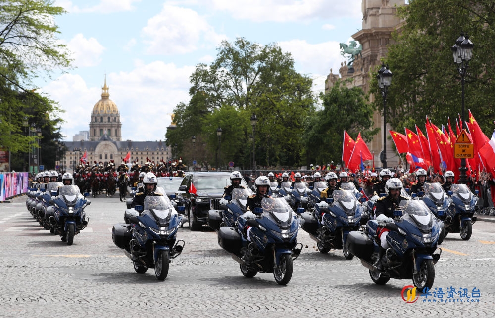 从机场至下榻酒店,摩托车队护卫左右。雄伟的凯旋门前,一面面中法国旗连成友谊的绚烂画卷,一幅幅红色横幅表达着对访问圆满成功的美好祝愿。鼓乐欢快,龙狮双舞,宽阔的香榭丽舍大街洋溢着浓浓的节日气氛。