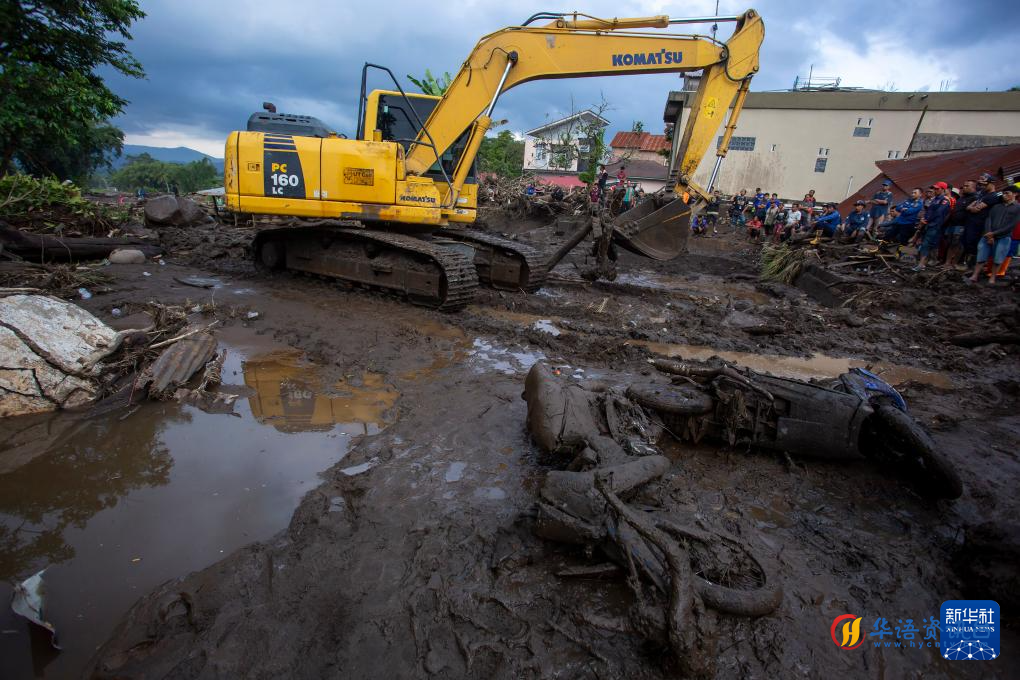 5月12日,在印度尼西亚西苏门答腊省,救援人员在被洪水侵袭的区域进行搜救工作。
