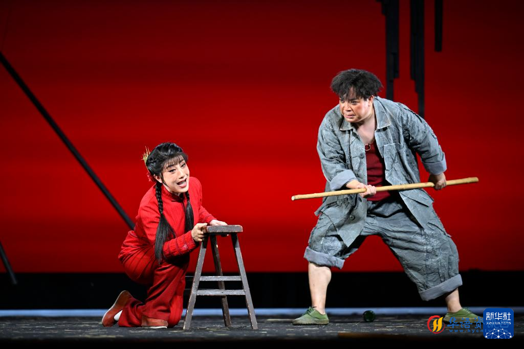 5月15日晚,在宁夏人民剧院,饰演李水河的侯艳(左)与饰演马三贵的韦小兵(右)在《攒劲女人》中表演。