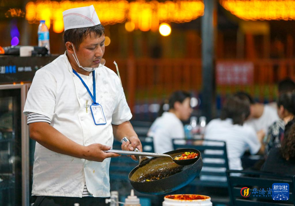 5月15日夜,厨师在吐鲁番葡萄夜市烹制菜肴。