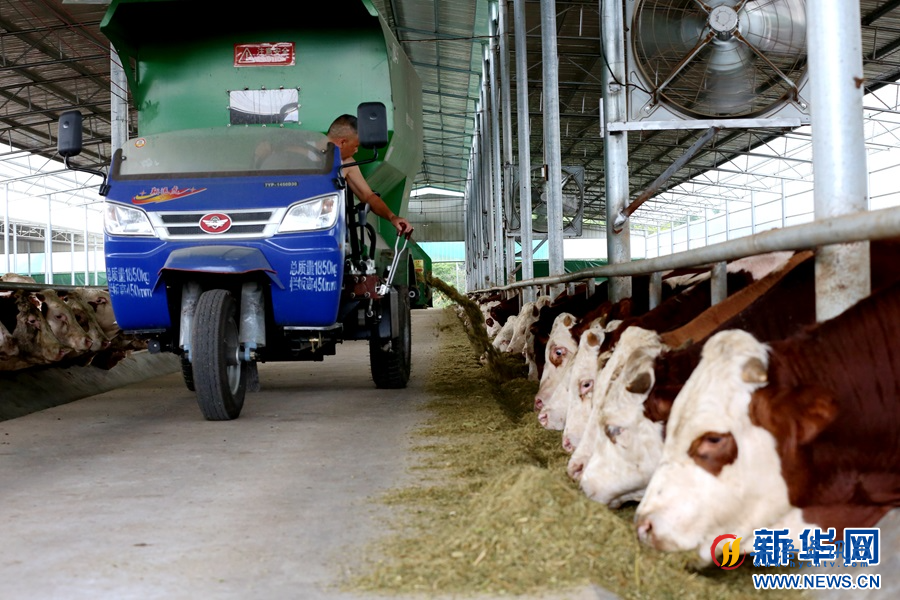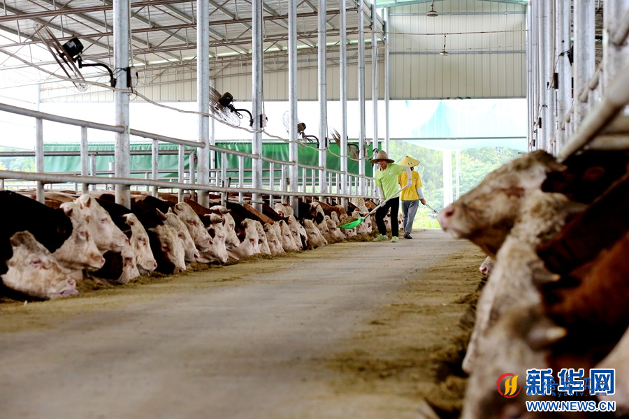 大余县青龙镇赤江村肉牛生态养殖基地,饲养员正在喂养西门塔尔牛。 新华网发 叶功富 摄