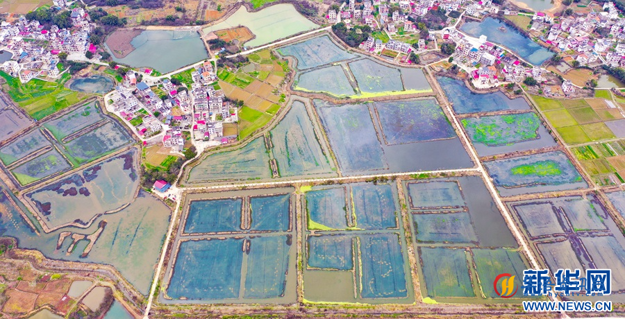 俯瞰大余县新城镇店孜里村“稻虾共作”种养基地。新华网发 叶功富 摄