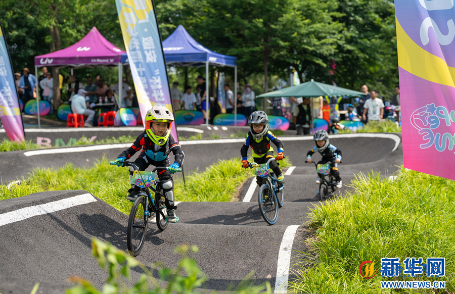 参加滑步车赛的小选手正在奋力角逐。新华网发(李晓红 摄)