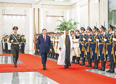 5月30日下午,国家主席习近平在北京人民大会堂同来华国事访问并出席中国—阿拉伯国家合作论坛第十届部长级会议开幕式的阿联酋总统穆罕默德举行会谈。这是会谈前,习近平在人民大会堂北大厅为穆罕默德举行欢迎仪式。 |