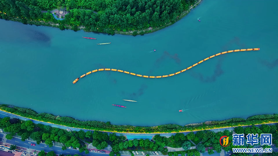 一条长达240米的金色“巨龙”和五条传统龙舟在水中巡游穿梭,“巨龙”由竹筏首尾相连组成,呈现出S形的蜿蜒轨迹,在灯光的映照下显得格外壮观,也寄托了群众对风调雨顺、国泰民安的美好愿望。