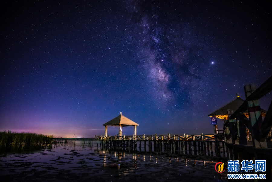 初夏,夜幕降临,在内蒙古自治区土默特左旗境内哈素海上空,点点繁星犹如撒落的珍珠,闪烁着迷人的光芒。新华网发 (申晧 摄)