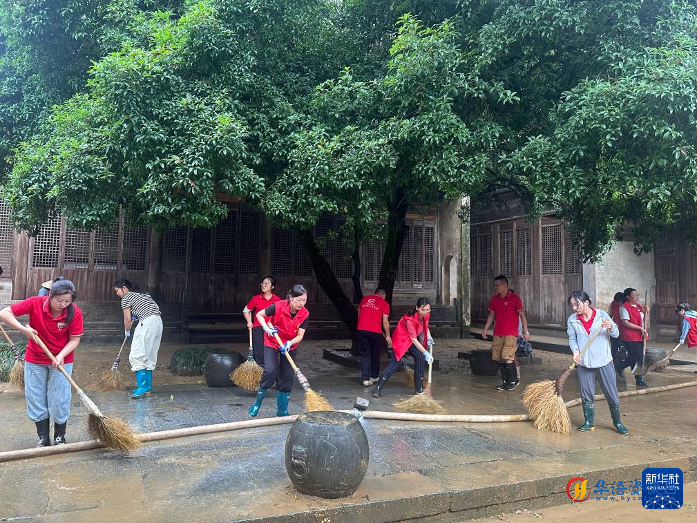 6月22日,在安徽省黄山市徽州区呈坎村,志愿者在清理地面淤泥。