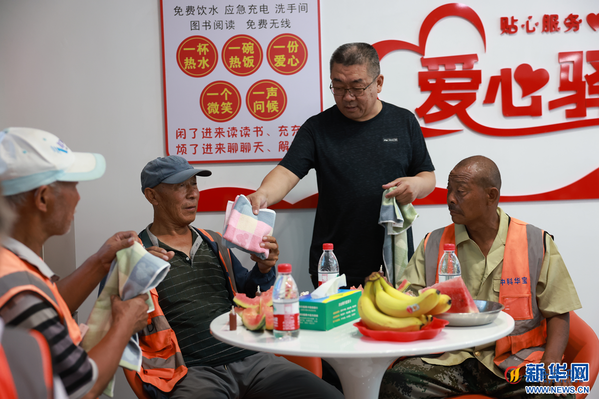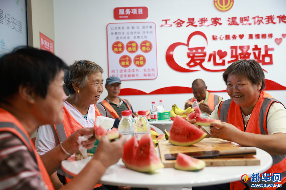 环卫工人在“爱心驿站”吃西瓜消暑。新华网发 李世强 摄