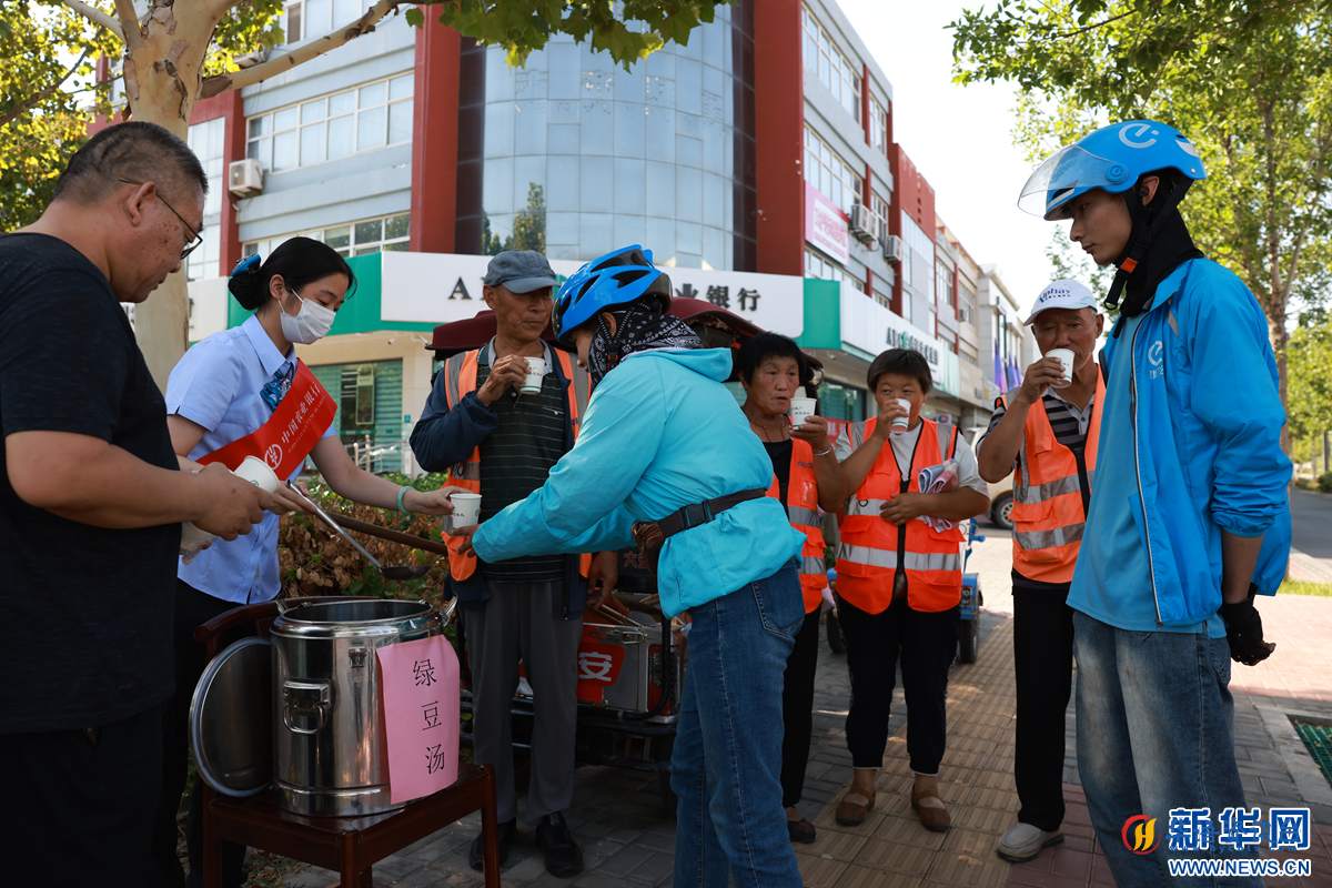 志愿者为外卖配送员、环卫工人盛绿豆汤。新华网发 李世强 摄