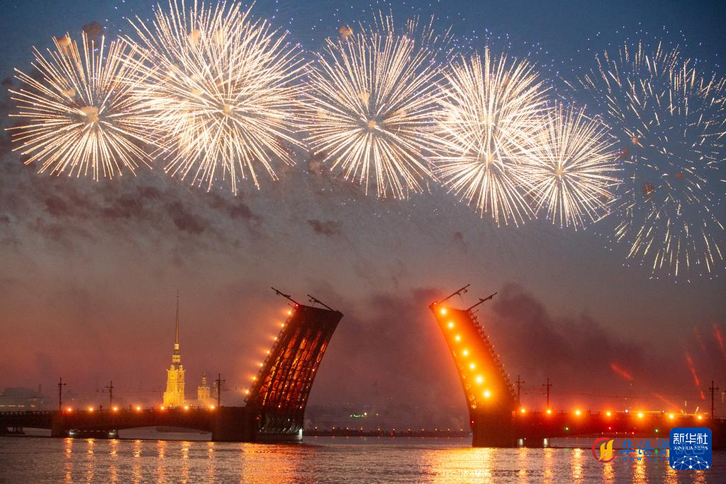 6月29日凌晨,俄罗斯圣彼得堡燃放烟花庆祝“红帆节”。