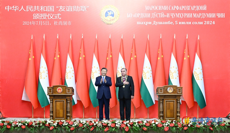 当地时间7月5日下午,习近平主席在塔吉克斯坦总统府举行隆重授勋仪式,向拉赫蒙总统颁授“友谊勋章”。
