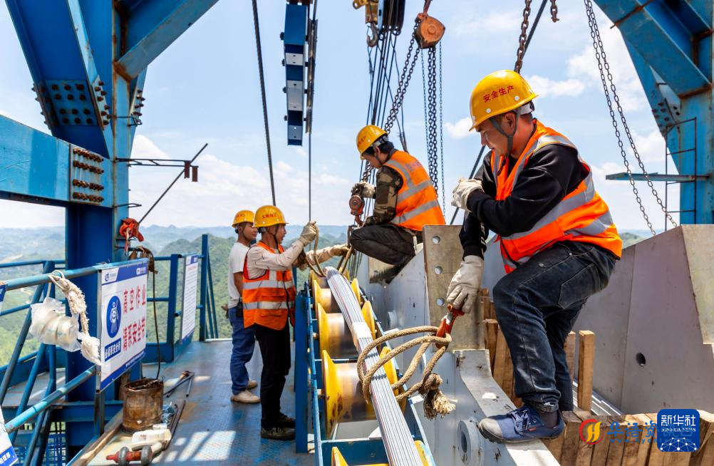 7月7日,工人在花江峡谷大桥6号主塔进行主缆索股架设施工。