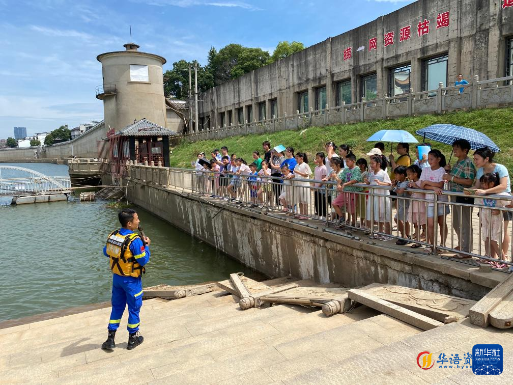 7月16日,在浏阳河畔的现场观摩与模拟演练环节,长沙县蓝天救援队队长陈槐提醒孩子们一定要远离危险水域,保护自身安全。